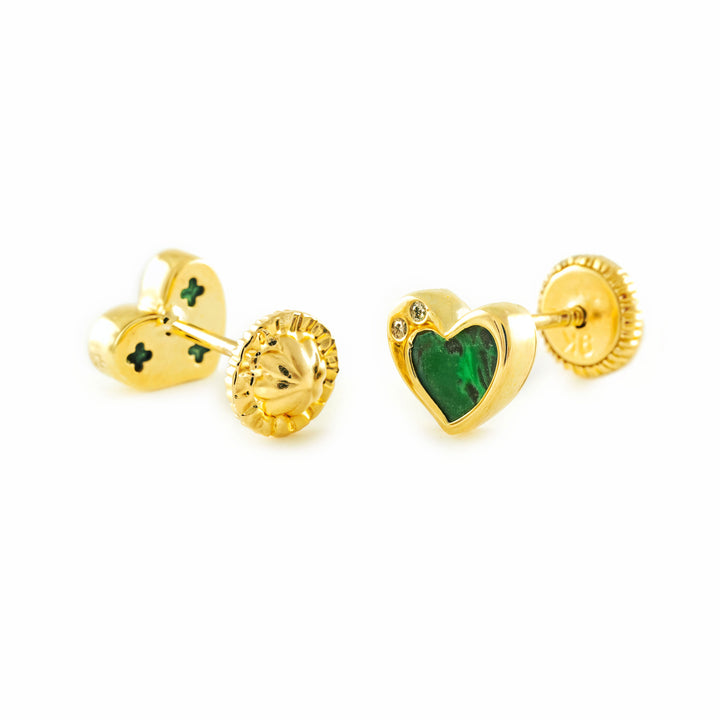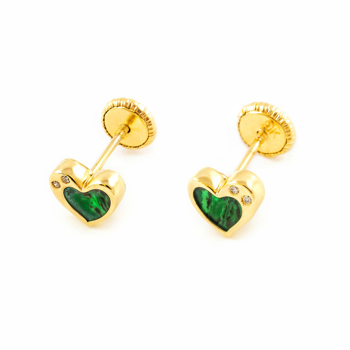 Pendientes Niña oro Amarillo 9K Corazón Piedra Malaquita Verde Brillo