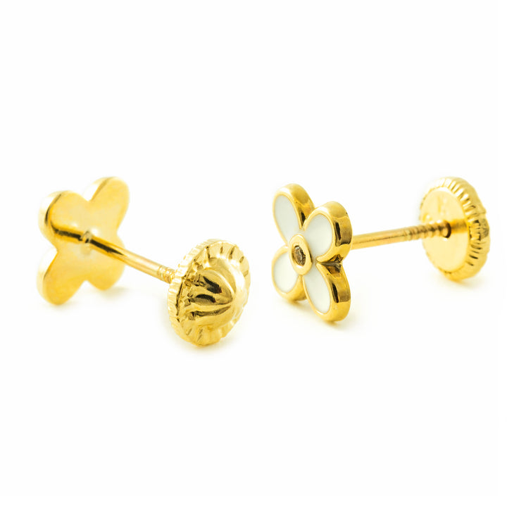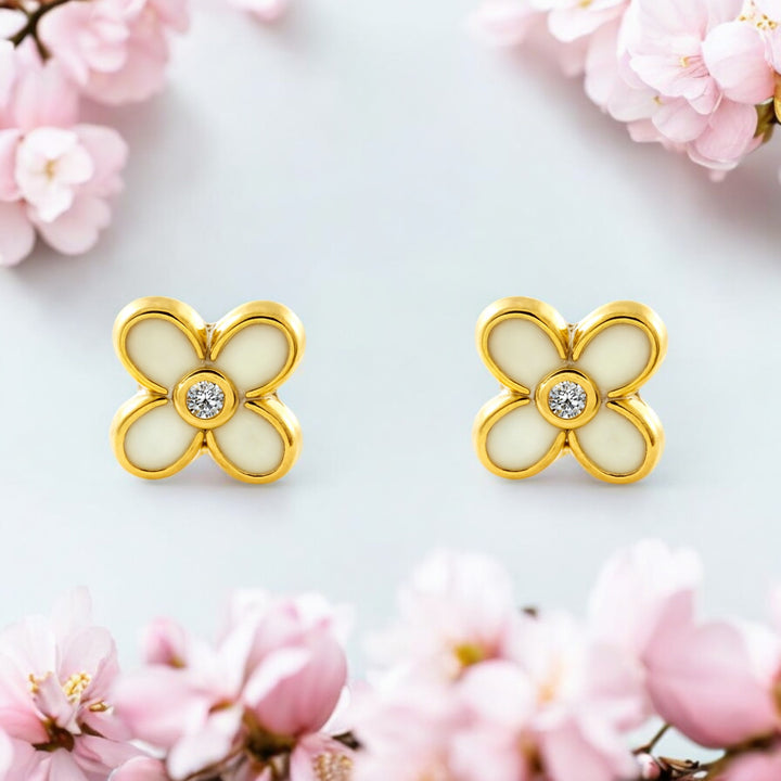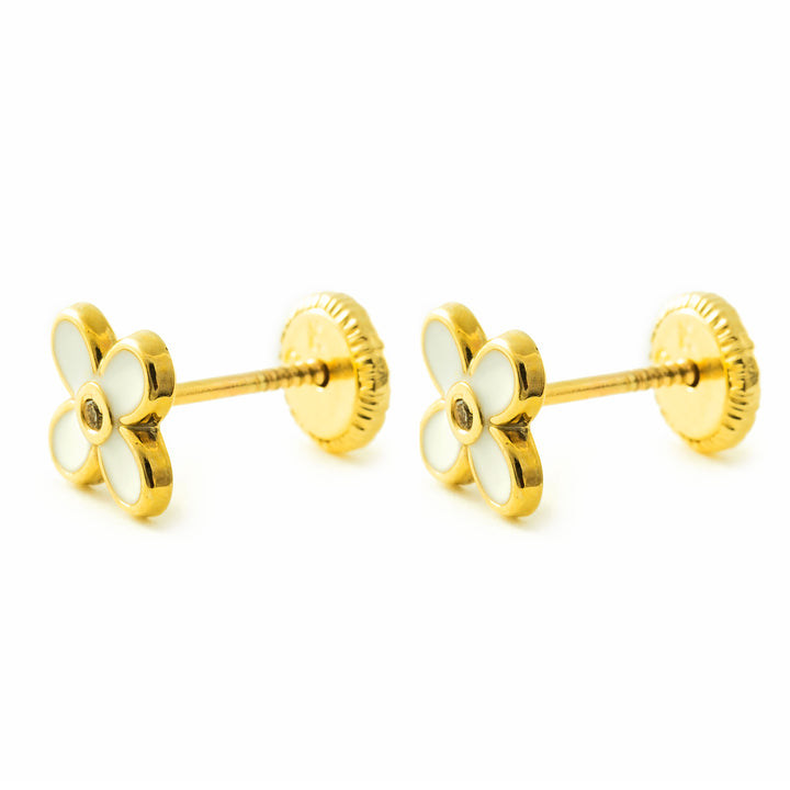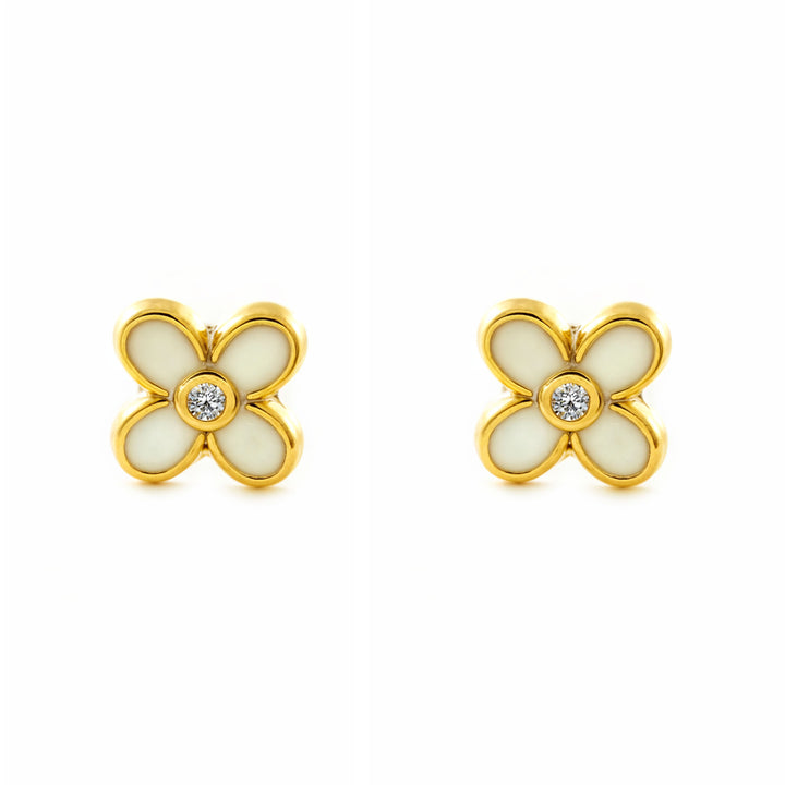 Orecchini Bambina Oro Giallo 9K Quadrifoglio Smalto Bianco Lucido