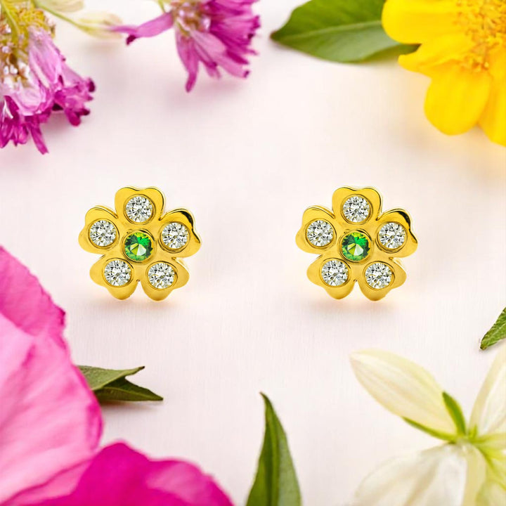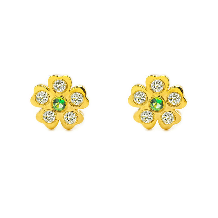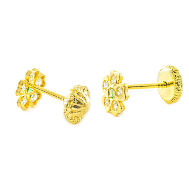 Orecchini Bambini Ragazza Oro Giallo 18K Fiore Zircone e Smeraldo Sintetico Brillante