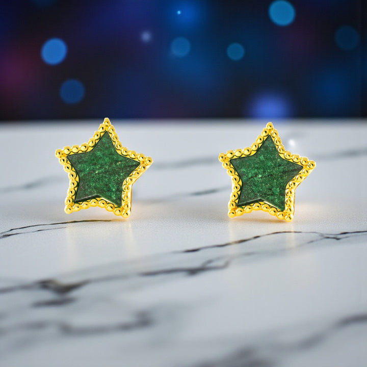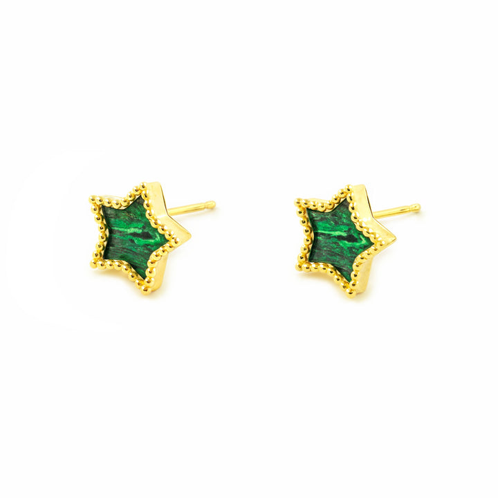 Scopri l'eleganza unica degli orecchini da donna in oro giallo 9K a forma di stella e pietra malachite verde. Il loro design combina la lucentezza dell'oro con la texture naturale della malachite, creando un gioiello sofisticato e moderno ideale per ogni occasione. Il contrasto tra l'oro e il verde intenso aggiunge un tocco di distinzione e freschezza al tuo look quotidiano.
