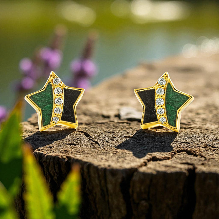 Orecchini ragazza donna stella pietra malachite verde brillante Oro Giallo 9K